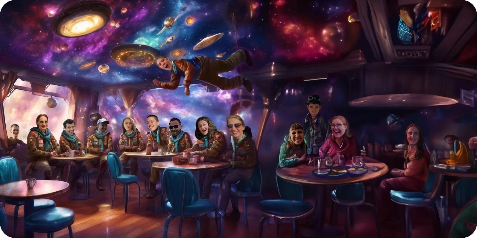 Willkommen im schwarzen Loch: Unsere Gravitation wird euch schon von weitem in den Bann ziehen. Habt ihr einmal den Ereignishorizont überschritten gibt es kein Entkommen mehr. Unser Team besteht aus verloren gegangenen Raumfahrenden aus der ganzen Galalaxis, die seit einem Lichtjahr das schwarze Loch in eine intergalaktische Oase mit abgespacter Stimmung verändert haben. Egal ob Raumfahrende, Aliens, Marsianer oder Hunde auf Weltraumreise, bei uns werden alle Gäste inkludiert und sind willkommen. Euch erwarten galalaktische Getränke, Kaffee und Kuchen, sowie weitere Speisen nicht von dieser Welt. Wir freuen uns, euch bald bald bei uns im schwarzen Loch begrüßen zu dürfen, Euer Pinten- und Café-Team.